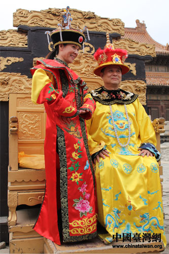 臺灣基層民眾游覽清東陵。圖為來自云林縣的一對夫妻戲“穿”回古代,精彩演繹著古代帝王帝后的別樣風情。(中國臺灣網(wǎng)發(fā) 張成標 攝)