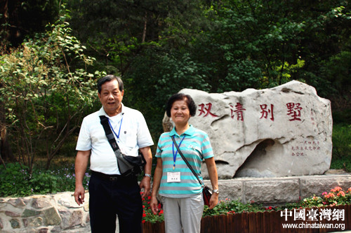 一對(duì)老夫妻在“雙清別墅”前合影留念。(中國(guó)臺(tái)灣網(wǎng) 劉承思 攝)