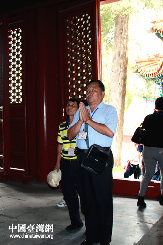 團(tuán)員李先生正在向佛像禮拜。(中國(guó)臺(tái)灣網(wǎng) 劉承思 攝)