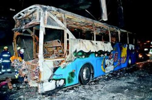 客運(yùn)巴士燒得只剩車架。(圖片來(lái)源于:臺(tái)灣《聯(lián)合報(bào)》)