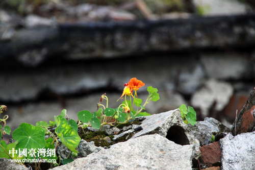 災后四年,采訪團來到殘破不堪的北川老城遺址祭拜遇難同胞。即將離開時,記者發(fā)現(xiàn)一朵橘紅色的小花在殘破的廢墟上悄然綻放。(中國臺灣網(wǎng) 楊麗 攝)