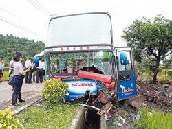 宜蘭梅花湖風景區(qū)發(fā)生重大車禍,游覽車撞上民宅圍墻(圖)造成車內37人受傷,駕駛座擋風玻璃全部碎裂,司機首當其沖,雙腿骨折受傷最嚴重。(圖片來源:臺灣《中國時報》)