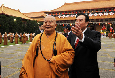 海協(xié)會會長陳云林(前右)24日率團抵達(dá)高雄訪問,下午前往佛光山拜訪星云大師(前左)。(圖片來源:臺灣今日新聞網(wǎng))