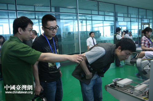 記者們?cè)诹窃夥a(chǎn)業(yè)園生產(chǎn)車間近距離觀察其生產(chǎn)設(shè)備。(中國(guó)臺(tái)灣網(wǎng) 郭瑩瑩 攝)