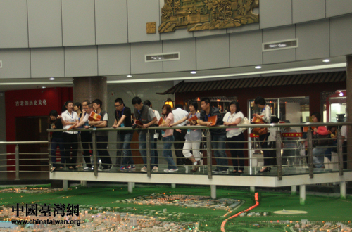 運(yùn)河博物館內(nèi)囊括整個(gè)聊城市面貌的巨大沙盤吸引了記者們的目光。(中國臺灣網(wǎng) 郭瑩瑩 攝)