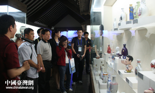 采訪團記者們對運河酒文化館內(nèi)臺灣專區(qū)的展品興趣濃厚。(中國臺灣網(wǎng) 郭瑩瑩 攝)