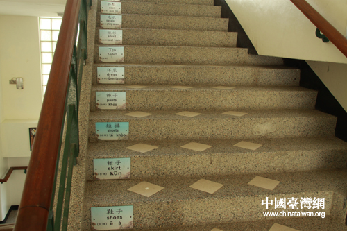 每個(gè)樓梯臺(tái)階都有關(guān)于服裝類的中文、英文、閩南語(yǔ)貼畫。(中國(guó)臺(tái)灣網(wǎng) 李丹 攝)