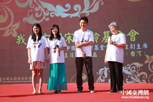 中國宋慶齡基金會副主席唐聞生(右)與《我們的心》詞曲作者陳莉家、李正磊(中),志愿者王菲(左)在一起。(中國臺灣網(wǎng) 孟雅詩 攝)
