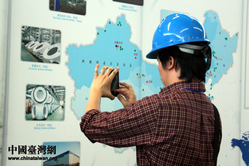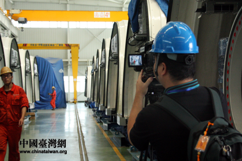 在酒泉新能源裝備制造產(chǎn)業(yè)園區(qū),臺(tái)灣中國(guó)電視公司記者方昶懿在新疆金風(fēng)科技股份有限公司參觀風(fēng)機(jī)設(shè)備。(中國(guó)臺(tái)灣網(wǎng) 郜利敏 攝)