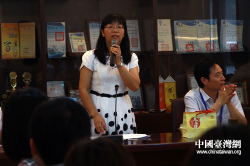 座談會上,臺中市大墩小學(xué)校長謝秀娟為大家介紹學(xué)校的整體情況、課程設(shè)置以及辦學(xué)理念。(中國臺灣網(wǎng) 李丹 攝)
