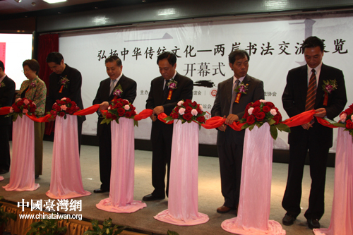 中國(guó)臺(tái)灣網(wǎng)6月1日北京消息 “弘揚(yáng)中華傳統(tǒng)文化--兩岸書法交流展覽”于6月1日在北京臺(tái)灣會(huì)館開幕。本次活動(dòng)為期5天,期間共展出兩岸書法名家作品一百余幅,其中臺(tái)灣作品68幅。海協(xié)會(huì)會(huì)長(zhǎng)陳云林、國(guó)民黨榮譽(yù)主席吳伯雄和;鶗(huì)董事長(zhǎng)江丙坤特地為本展覽給予題詞祝賀。海協(xié)會(huì)副會(huì)長(zhǎng)王富卿出席并宣布展覽開幕。