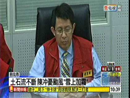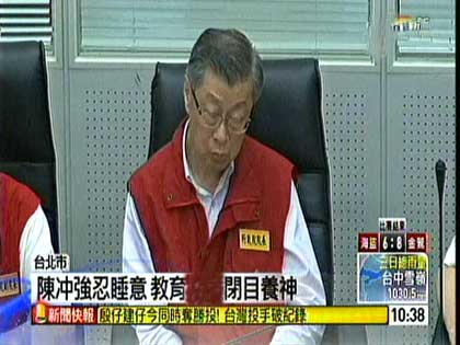 中國(guó)臺(tái)灣網(wǎng)6月13日消息 據(jù)臺(tái)灣媒體報(bào)道,連日豪雨臺(tái)灣各地災(zāi)情嚴(yán)重,馬英九取消今日所有行程,到臺(tái)“中央災(zāi)害應(yīng)變中心”坐鎮(zhèn)指揮救災(zāi)。報(bào)道稱(chēng),臺(tái)當(dāng)局“行政院長(zhǎng)”陳沖結(jié)束臺(tái)灣南部視察行程后,也到應(yīng)變中心現(xiàn)場(chǎng),不過(guò)可能是因?yàn)樘^(guò)疲累,聽(tīng)簡(jiǎn)報(bào)時(shí)陳沖連打瞌睡、頻頻點(diǎn)頭,好幾次苦撐著睜眼,讓自己不要真的睡著。