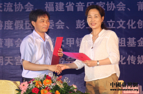 福建省音樂家協(xié)會副主席、秘書長唐曉燕與湄洲島管委會主任唐炳椿簽訂聯(lián)辦“海峽兩岸(湄洲島)音樂創(chuàng)作基地”協(xié)議。(中國臺灣網(wǎng) 郭瑩瑩 攝)