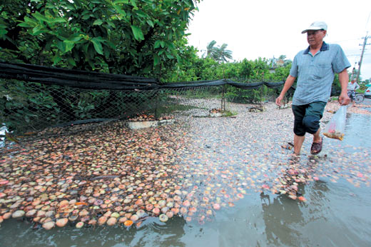 豪大雨造成屏東林邊淹水不退,當(dāng)?shù)厣忟F落果嚴(yán)重,農(nóng)民欲哭無淚,擔(dān)心連蓮霧樹株也將不保。圖片來源:臺灣《聯(lián)合報》