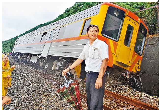 臺鐵一列載有230名旅客的自強(qiáng)號列車,昨在南回鐵路臺東縣大武鄉(xiāng)路段撞上泥石流,第1節(jié)車廂出軌傾斜,圖為車廂出軌傾斜,隨車機(jī)務(wù)員林世杰冒雨檢視列車情況。圖片來自臺媒