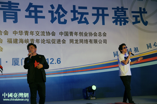 水木年華組合亮相第十屆海峽青年論壇開幕式暨十年紀(jì)念活動并深情獻(xiàn)唱。(中國臺灣網(wǎng) 王思羽 攝)