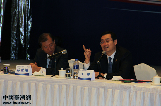 中華全國青年聯(lián)合會主席王曉、中國青年創(chuàng)業(yè)協(xié)會總會長陳世銘共同出席會議,王曉在會上發(fā)表講話。(中國臺灣網(wǎng) 王思羽 攝)