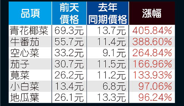 臺(tái)北果菜市場(chǎng)前天整體蔬菜批發(fā)價(jià)每公斤26元,較去年同期17.4元漲近5成,其中青花椰菜每公斤69.3元、較去年同期漲4倍、空心菜漲2.6倍、小白菜、地瓜葉也漲了近1倍。