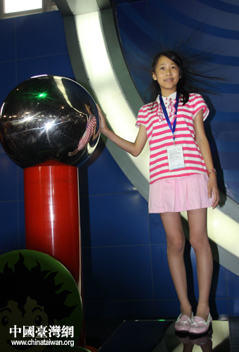 黃繹心小朋友在四川科技館體驗(yàn)“怒發(fā)沖冠”。(中國臺灣網(wǎng) 王偉 攝)