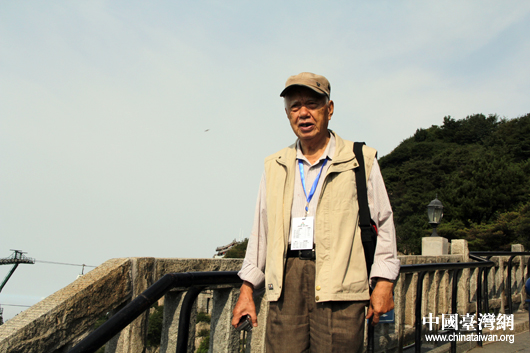 82歲的畫家何肇衢先生拄著拐杖一步一步走到玉皇頂。(中國臺灣網 芮益芳 攝)