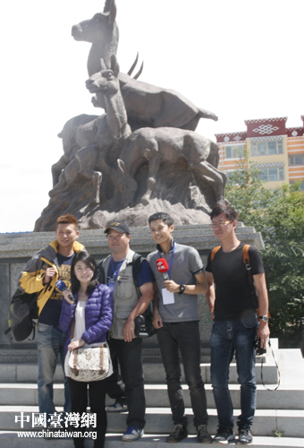 臺灣媒體在可可西里保護區(qū)管理局前合影留念(中共臺灣網(wǎng) 陳寧 攝)