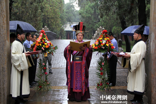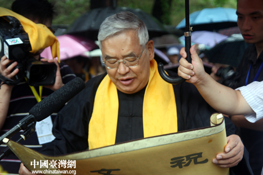 參加“情系齊魯——兩岸文化聯(lián)誼行”的臺(tái)灣嘉賓團(tuán)顧問(wèn)曾永義教授恭讀祭文(中國(guó)臺(tái)灣網(wǎng) 蕪?fù)?攝)