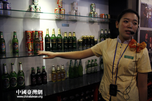 “情系齊魯——兩岸文化聯(lián)誼行”參訪嘉賓參觀青島啤酒博物館,講解員介紹青啤種類。(中國臺(tái)灣網(wǎng) 芮益芳 攝)