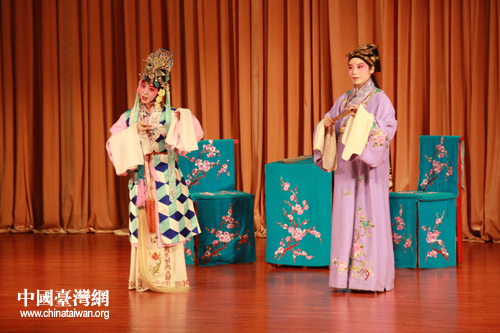 來(lái)自臺(tái)灣師范大學(xué)昆曲研究社的李念潔(左)與北京師范大學(xué)以雅昆曲社的齊天琪(右)共同表演昆曲《玉簪記·琴挑》。(中國(guó)臺(tái)灣網(wǎng) 孟雅詩(shī) 攝)