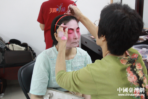 臺灣師范大學昆曲研究社、中華昆曲藝術協(xié)進會常務理事蔡孟珍女士在后臺上妝。(中國臺灣網(wǎng) 孟雅詩 攝)
