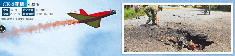 CK-3靶機(jī) 軍演靶機(jī)墜落臺東大武鄉(xiāng)間公路上,砸出一個(gè)大洞。
