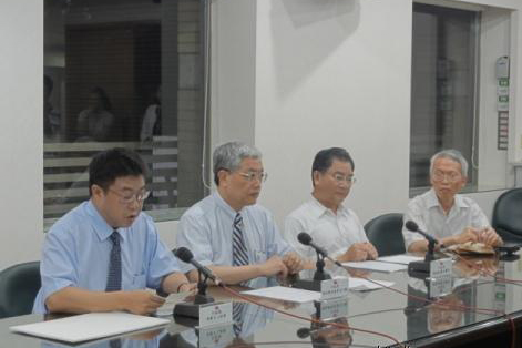 臺(tái)當(dāng)局“行政院”發(fā)言人胡幼偉(左起)、秘書(shū)長(zhǎng)陳士魁、副秘書(shū)長(zhǎng)陳慶財(cái)。圖片來(lái)源:臺(tái)灣“今日新聞”