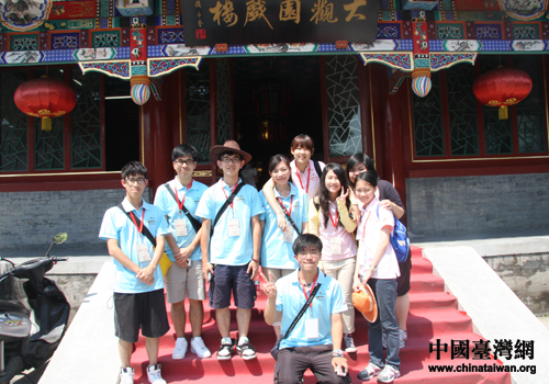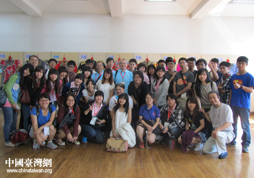 臺(tái)灣輔仁大學(xué)的師生們?cè)诖笥^園戲樓前合影留念。(中國(guó)臺(tái)灣網(wǎng) 李瑞艷 攝)