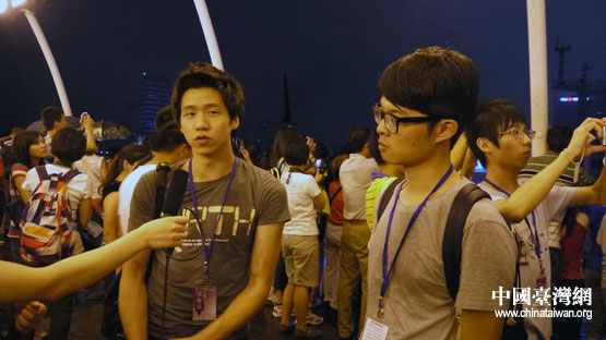 淡江大學(xué)企管學(xué)系張壹翔是臺灣學(xué)生團第六組組長,他多才多藝,最愛張學(xué)友的歌!白x萬卷書不如行萬里路,我想透過這次活動欣賞到大氣磅礴的大陸風(fēng)光,更能了解中華文化的博大精深、拓展心胸,也希望能交到許多志同道合的好友,充實人生的旅途!眻D為張壹翔接受本網(wǎng)記者采訪。(中國臺灣網(wǎng) 李丹 攝)
