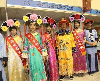 某影視文化城現(xiàn)場錄取的男女人員當(dāng)場穿上格格裝,幫忙招募員工,赫見“男”格格。(來源:臺灣媒體)