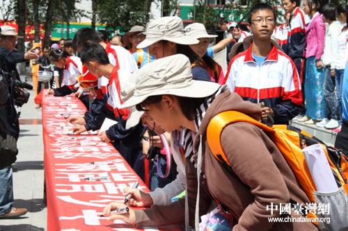 京臺(tái)青三地學(xué)生共同在啟動(dòng)橫幅上簽字留念(中國(guó)臺(tái)灣網(wǎng) 趙輝 攝)
