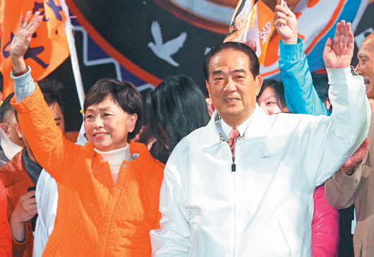 今年1月13日臺灣地區(qū)領(lǐng)導(dǎo)人選舉的選前之夜,親民黨候選人宋楚瑜(右)和夫人陳萬水(左)同臺造勢,現(xiàn)場氣氛溫馨感人;相隔才半年,陳萬水卻已病逝。(來源:臺灣《聯(lián)合報》)