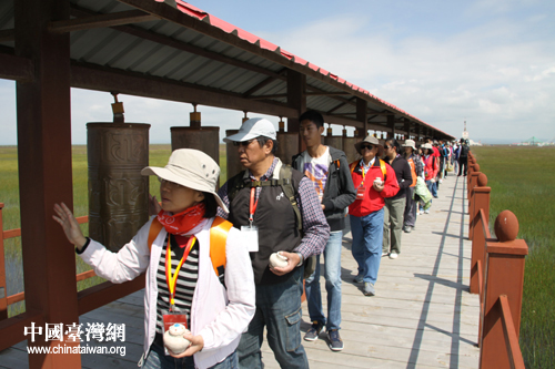 京臺兩地師生走過青海湖棧道上的轉(zhuǎn)經(jīng)筒(中國臺灣網(wǎng) 趙輝 攝)