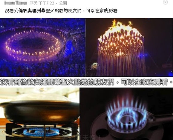 臺(tái)灣網(wǎng)友制作Kuso(惡搞)圖片:沒(méi)看到圣火點(diǎn)燃的朋友們,可以在家里廚房看看,只要把瓦斯?fàn)t火打開(kāi)就很像了。 圖片來(lái)源于網(wǎng)絡(luò)