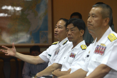 臺(tái)軍海軍司令董翔龍上將(左)6日率領(lǐng)相關(guān)人員出席記者會(huì),說(shuō)明臺(tái)灣168艦隊(duì)隊(duì)長(zhǎng)張鳳強(qiáng)少將逾越操演范圍的經(jīng)過(guò)。圖片來(lái)源:臺(tái)灣“今日新聞網(wǎng)”