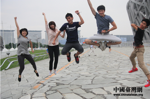 團(tuán)員們在鳥巢前擺出“高難度”跳躍動作(中國臺灣網(wǎng) 吳曉寒?dāng)z)