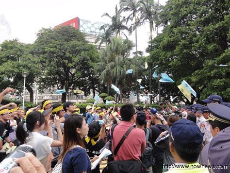 擔(dān)憂捷運(yùn)新莊機(jī)場安全的抗議群眾將“監(jiān)察院”糾正文折成紙飛機(jī)射向“行政院”。(圖片來自臺(tái)灣今日新聞網(wǎng))