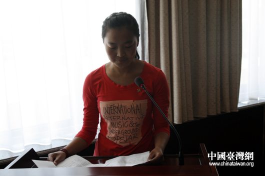 蘇日亞來(lái)自內(nèi)蒙古克什克騰旗巴彥查干蘇木恩格爾寶力格嘎查,她在發(fā)言中代表獲獎(jiǎng)學(xué)生家庭向頂新基金會(huì)表示感謝(中國(guó)臺(tái)灣網(wǎng) 蕪?fù)?nbsp;攝)