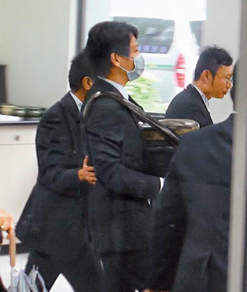 陶喆(中)神情肅穆,捧著父親陶大偉的骨灰快步離去。(圖片來自臺(tái)媒)