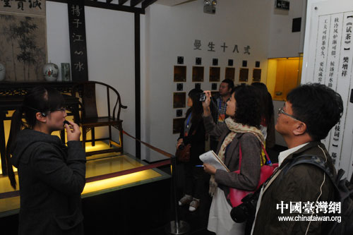 圖為兩岸記者參訪蒙頂山世界茶文化博物館,聽導(dǎo)游講解茶葉的知識、茶的歷史及茶文化藝術(shù)等。(四川省臺辦供圖)