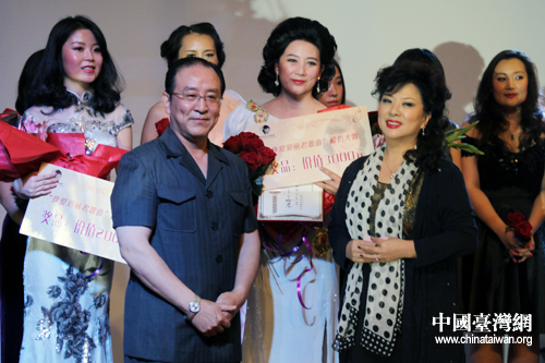 中國民族貿(mào)易促進(jìn)會(huì)執(zhí)行會(huì)長劉延寧與臺(tái)灣的著名音樂人左宏元(古月)先生為冠軍潘帆頒獎(jiǎng)。(中國臺(tái)灣網(wǎng) 吳怡 攝)
