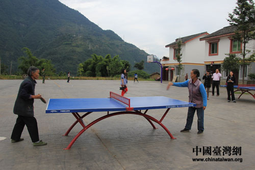 災后重建的先鋒鄉(xiāng)松林村居民安居樂業(yè)。圖為村里兩位老人在打乒乓球,她們嫻熟的球技吸引了前來參觀的兩岸記者。(中國臺灣網 王曉蕊 攝)