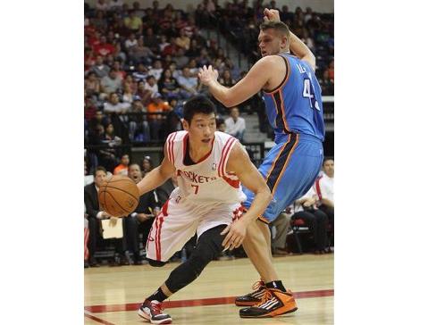 林書豪在熱身賽首戰(zhàn)面對(duì)雷霆的比賽中上場(chǎng)20分鐘,投3中1繳出3分6助攻3抄截的成績(jī)。圖片來自臺(tái)媒