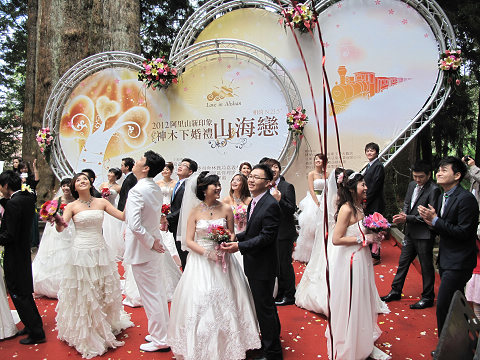 中國臺灣網(wǎng)10月12日消息 據(jù)臺灣“今日新聞網(wǎng)”報道,為推廣臺灣訂婚主題游程,臺當(dāng)局“交通部觀光局”籌劃的“旅行臺灣,就是現(xiàn)在”浪漫系列活動,于今日推出“2012阿里山新印象—神木下婚禮山海戀”,此次將有13對新人在阿里山千年神木的見證下互許神圣的誓言,完成終身大事,其中有3對新人是來自山東和江蘇的佳偶。