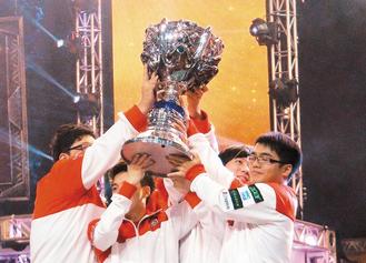 電玩英雄聯(lián)盟第二季世界錦標(biāo)賽,臺(tái)灣代表隊(duì)“臺(tái)北暗殺星”擊敗韓國對手,贏得冠軍,全體隊(duì)員在頒獎(jiǎng)典禮上高舉獎(jiǎng)杯。圖片來源:臺(tái)灣《聯(lián)合報(bào)》