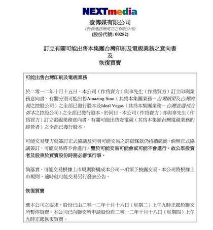 公告指出,今年10月15日,壹傳媒已與買方辜仲諒訂立印刷業(yè)務(wù)及電視業(yè)務(wù)意向書,就有關(guān)可能出售臺灣《蘋果日報》、《爽報》及壹電視業(yè)務(wù)作出說明。